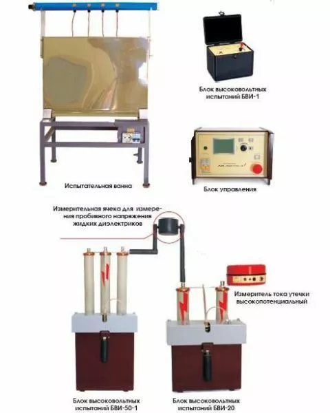 - визначення пробивної напруги рідких діелектриків напругою частотою 50 Гц до 50 кВ (по ГОСТ 6581-75). Вимірювання струмів витоку випробовуваних об'єктів (захисних засобів, розрядників і т.д.)